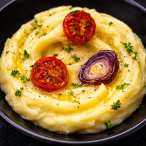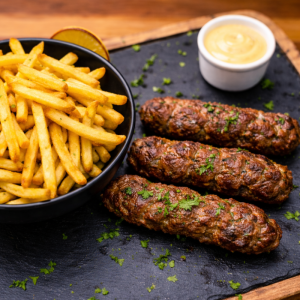 Chicken breast skewers grilled over charcoal, served with freshly french fries. The dish is completed with cucumber salad, Kalamata olives, tzatziki sauce, roasted tomato, roasted hot pepper, and warm flatbread for a delicious combination of crispy, creamy, and spicy flavors.