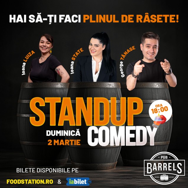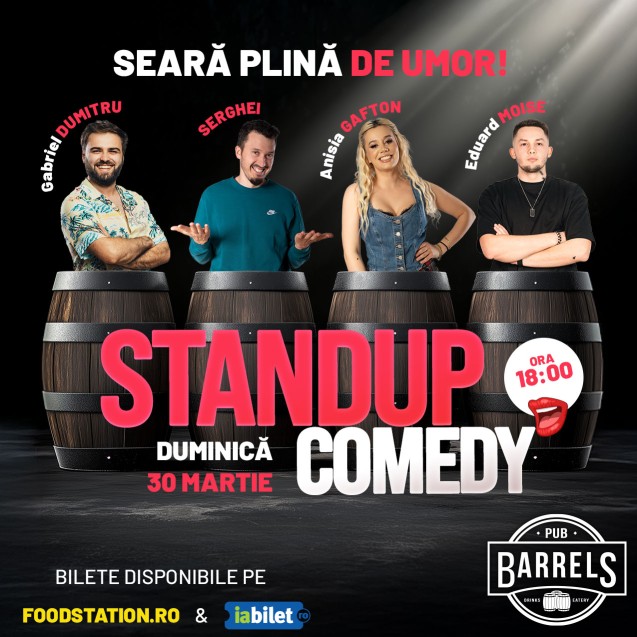 Gabriel Dumitru, Serghei, Anisia Gafton și Eduard Moise – comedianți pe val, mega iubiți și nebuni de amuzanți – urcă pentru prima dată pe scena noastră să transforme o seară obișnuită într-un spectacol epic de stand-up.Ei sunt genul de oameni care îți schimbă mood-ul din "meh" în "nu mai pot de râs"!Dacă ați achiziționat bilete online și doriți să stați la aceeași masă cu alte persoane care au cumpărat biletele separat, vă rugăm să ne sunați la 0799070207 imediat după finalizarea comenzii, pentru a organiza locurile la masă. Rezervările pentru mese de câte două persoane se vor share-ui cu alte persoane pentru o organizare cât mai eficientă a spațiului. Mesele se vor aloca în ordinea rezervărilor și a sosirii în locație, așa că vă recomandăm să veniți din timp pentru a vă bucura de o seară fără griji.Barrels Pub devine destinația comediei. Ne vedem acolo!