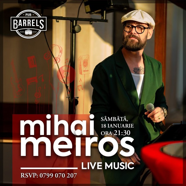 De la București la Mamaia, începem 2025 la #BarrelsPub cu o seară de muzică live alături de MIHAI MEIROS! Un artist complex și un showman desăvârșit, Mihai aduce vibe-ul perfect pentru o cină între prieteni, atmosferă relaxată și momente care te ridică de pe scaun. Deci, ne vedem?